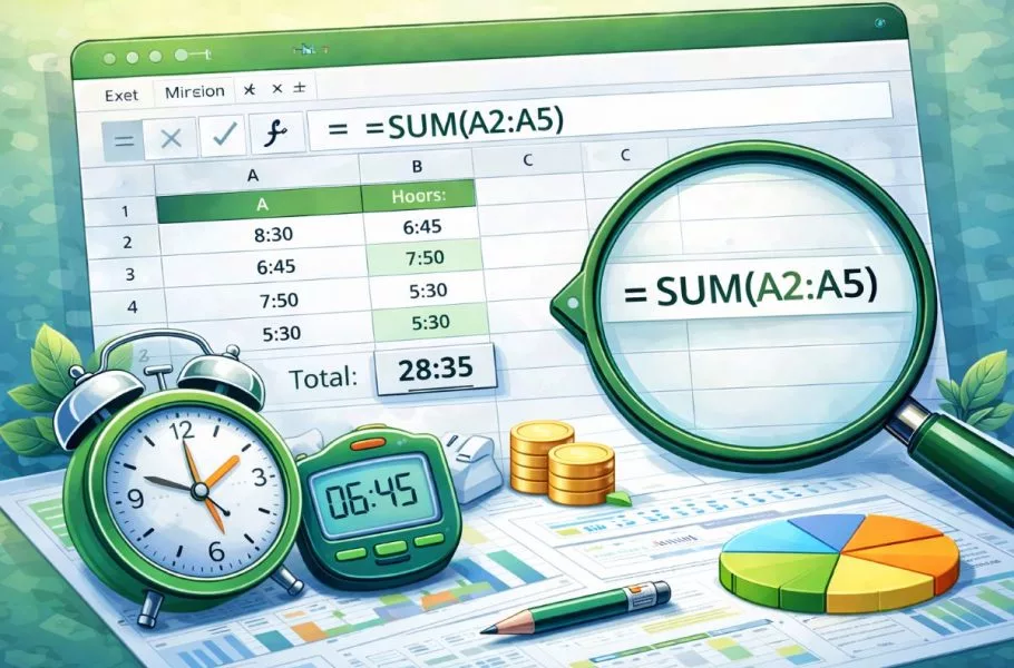 پس از محاسبه ساعت هر ردیف، میتوانید با تابع SUM مجموع کل ساعات را محاسبه کنید. این روش برای جمع زدن ساعت کاری در اکسل در فایلهای واقعی بسیار کاربردی است.