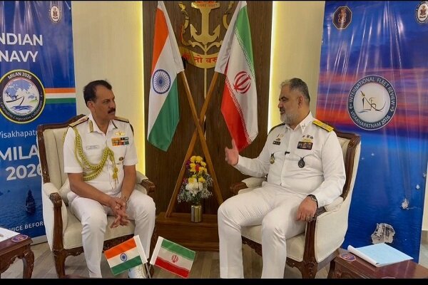 به گزارش خبرگزاری مهر، امیر دریادار شهرام ایرانی، فرمانده نیروی دریایی ارتش جمهوری اسلامی ایران، در حاشیه برگزاری رزمایش بینالمللی «میلان ۲۰۲۶»، با دریادار دینش کی تریپاتی، فرمانده نیروی دریایی هند دیدار و پیرامون گسترش همکاریهای آموزشی، تبادل هیأتهای نظامی، برگزاری دورههای تخصصی مشترک و افزایش تعاملات عملیاتی در حوزههای امداد و نجات دریایی، مقابله با دزدی دریایی و تأمین امنیت خطوط کشتیرانی بینالمللی رایزنی کرد.