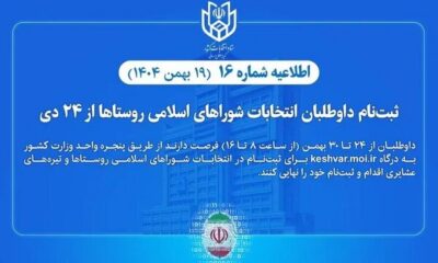 ستاد انتخابات کشور در اطلاعیه شماره ۱۶ اعلام کرد: ثبتنام داوطلبان انتخابات شوراهای اسلامی شوراهای اسلامی روستاها و تیرههای عشایری سراسر کشور از ۲۴ تا ۳۰...